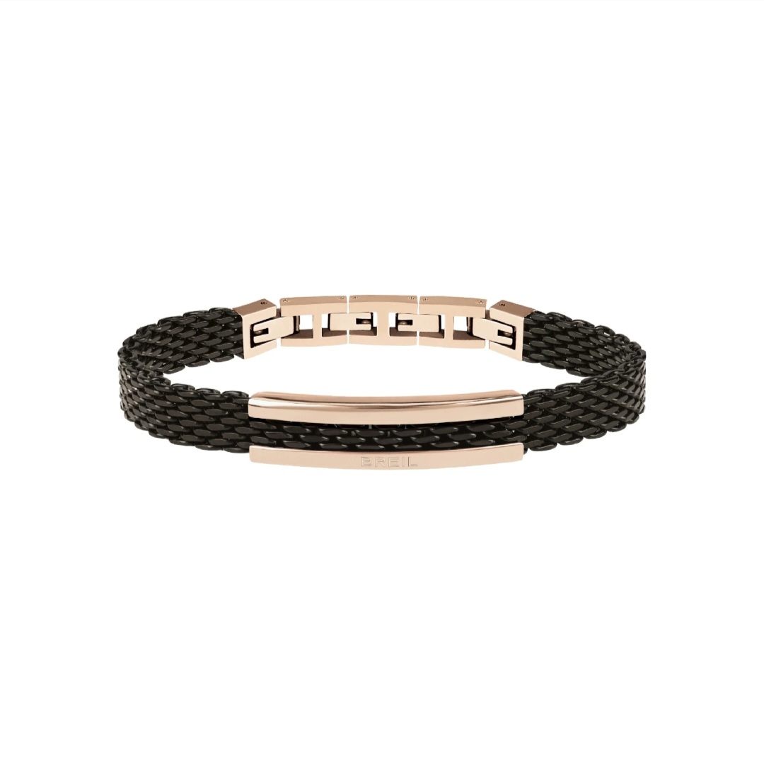 Men's bracelet with pink IP steel plate and IP gun colored steel Milanese mesh. Elegant and modern, perfect with every look.