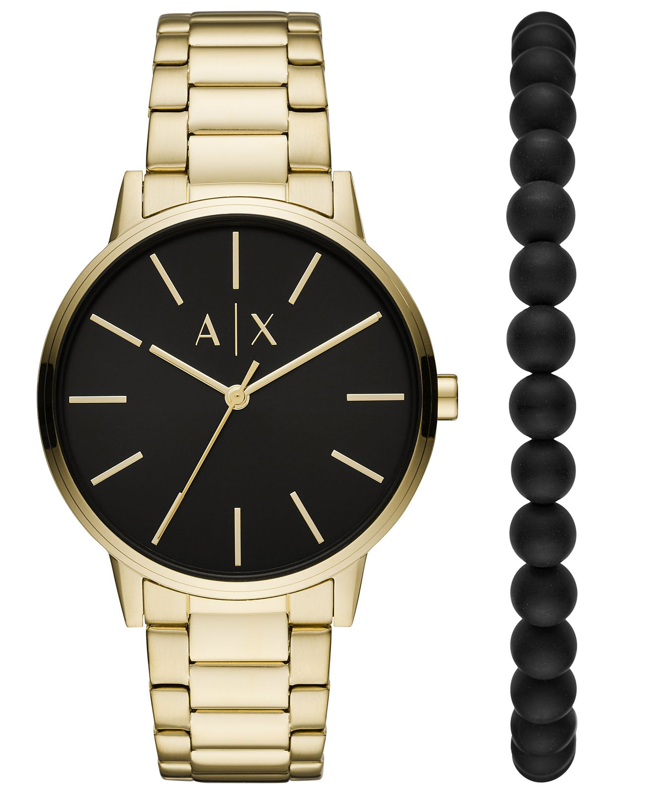 Set with men's time-only watch by Armani Exchange. Watch with round case with a diameter of 42 mm and a thickness of 8 mm. Case made of gold-colored stainless steel with a polished and satin finish and transparent glass. Watch with black dial with gold-colored stainless steel bezel and satin finish. Model with bracelet strap in gold-colored stainless steel with a polished and satin finish, with deployant clasp, the distance of the lugs is 20 mm. Watch with 3-hand quartz movement and water resistance of 5 atm. Set consisting of watch and bracelet. The reference is ax7119 This item will be shipped with the Original Armani Exchange Box if required by the brand