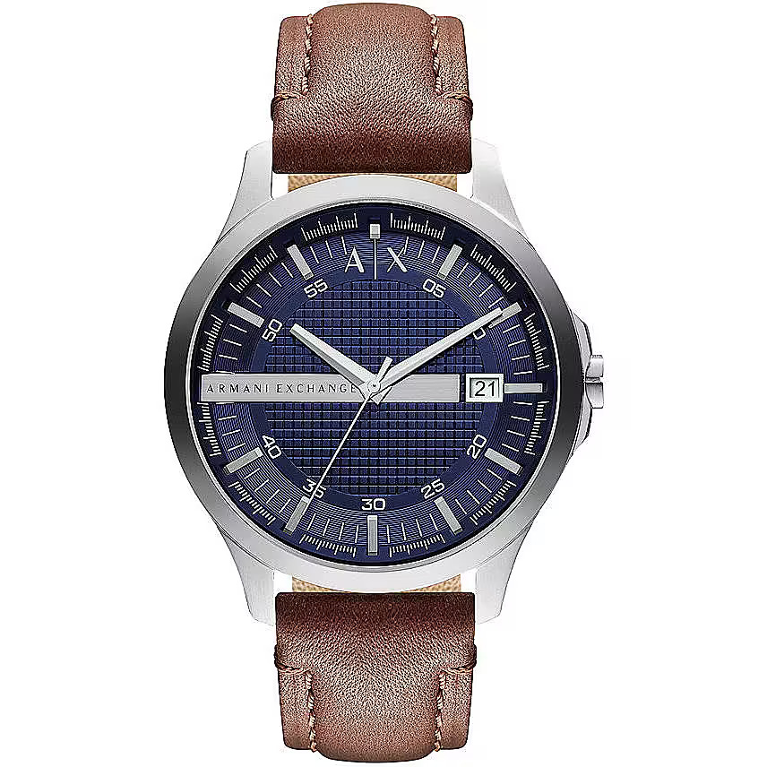 Armani Exchange men's time only watch from the Hampton collection. Model with round case in silver-colored stainless steel and steel with a polished and satin finish. Case diameter of 46 mm and thickness of 11 mm. Bezel in silver-colored stainless steel and steel with a polished finish. The dial is blue with transparent glass. Dark brown leather strap and pin buckle. The distance between the lugs is 20 mm. Watch with 3-hand quartz movement and date display and water resistance of 5 atm. The reference is ax2133 This item will be shipped with the Original Armani Exchange Box if required by the brand